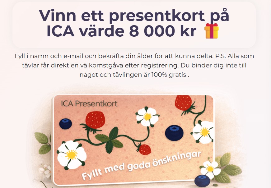 Gå med i tävlingen helt gratis – för att sedan ta chansen att vinna ett presentkort värt 8000 kr. Presentkortet kan du använda hos alla ICA-butiker runtom i hela Sverige. Ett utmärkt knep för att få pengar gratis och kan användas på mat och dryck. Det ger dig garanterat mer svängrum i din ekonomi!